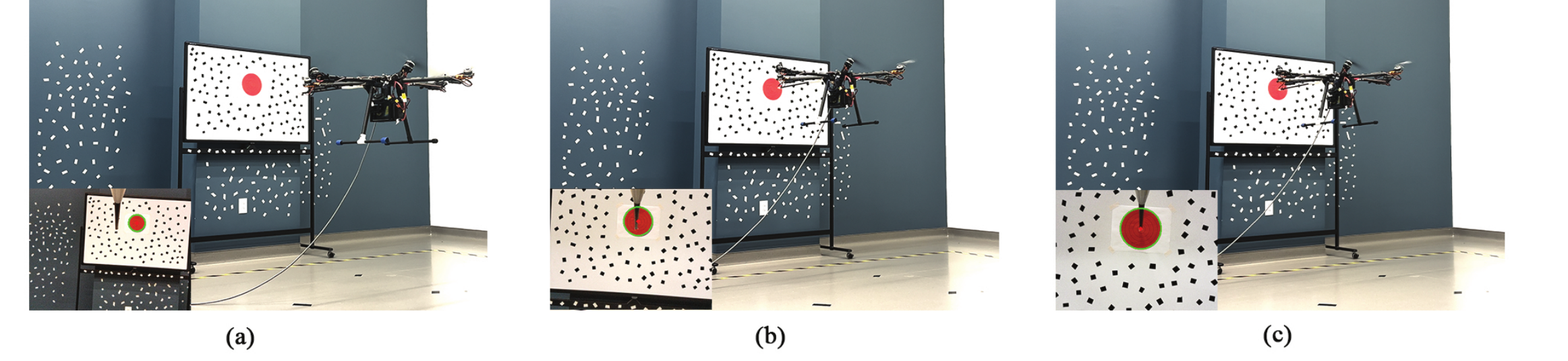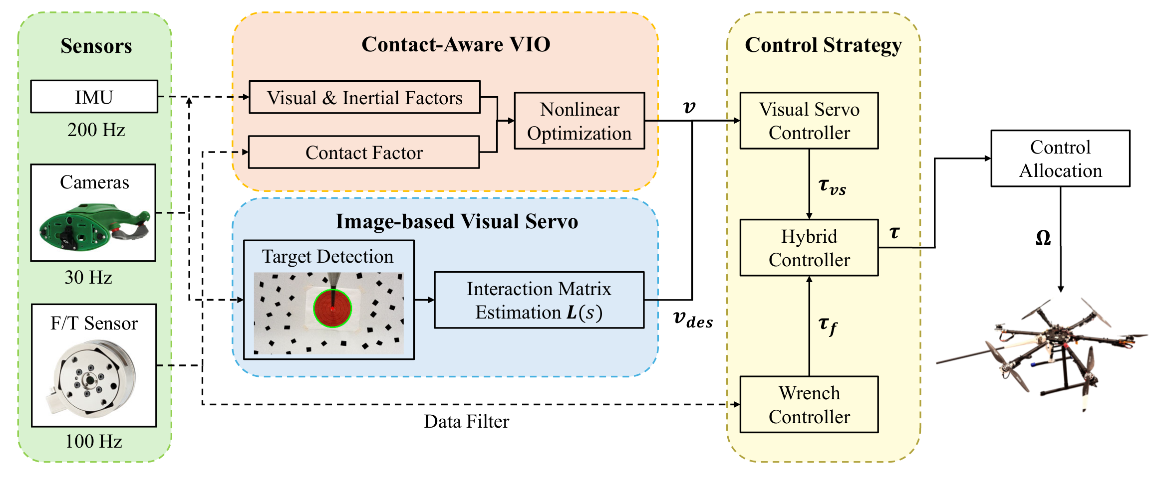 The proposed pipeline has three key components: (1) A contact-aware VIO processes stereo imagery to produce vehicle/end-effector state estimates, activating contact factors only during interaction. (2) During approach, image-based visual servoing (IBVS) drives the platform using only the VIO-estimated body velocity. (3) Upon contact, a hybrid force–motion controller regulates the normal wrench while IBVS continues to track lateral motion, closing the perception-to-wrench loop with onboard sensing.
