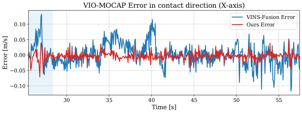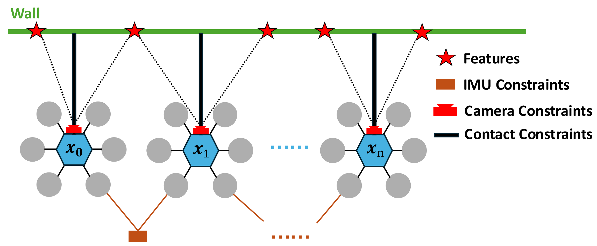 Our method builds upon VINS-Fusion, where visual–inertial state estimation is expressed within a factor graph framework, and the system state is recovered through joint optimization of camera reprojection errors and IMU pre-integration constraints. While this formulation achieves high accuracy in general scenarios, it may suffer from drift when external interactions occur. To mitigate this issue, we extend it by introducing contact factors that leverage robot–environment interactions. In particular, when the system is in contact with a wall, the relative motion at the contact point is constrained, and this information is encoded as an additional factor in the graph. By incorporating such constraints, the estimator gains improved robustness and reduced drift, especially in environments with limited visual features or long-term operation.